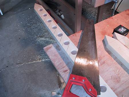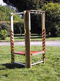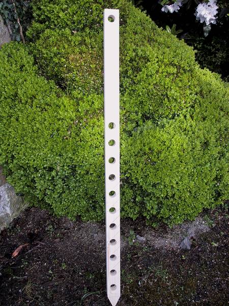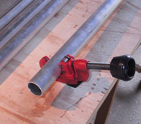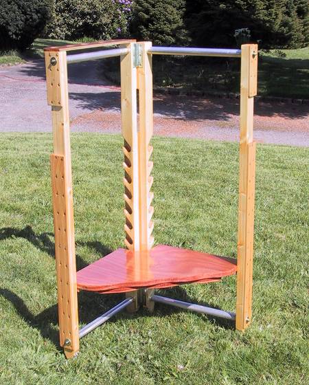 Pour la construction, j'ai utilisé les chutes des tubes d'aluminium de 30 mm de diamètre de mon Dobson, 2 grands tasseaux en pin de 35 x 57 x 240 cm, 2 lattes de 10 x 80 x 200, une planche de CP CTBX de 20 mm de 56 x 100, 1 tasseau de 18 x 18 x 200, deux charnières, de la visserie et 3 couches de vernis marin.